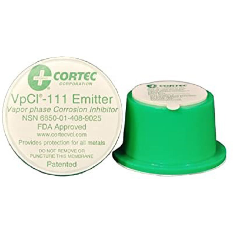This Vapor phase Corrosion Inhibitor (VpCI) emit vapors which form a molecular layer on internal metal surfaces to protect critical, complex and expensive electronic equipment during operation, shipping or storage. It has a small patented plastic emitter with a breathable Tyvek membrane through which corrosion inhibitors are slowly released. This inhibitor provides long-term protection against corrosion even in the presence of adverse conditions, including salt, moisture, airborne contaminants, H2S, SO2, NH3 and others.
